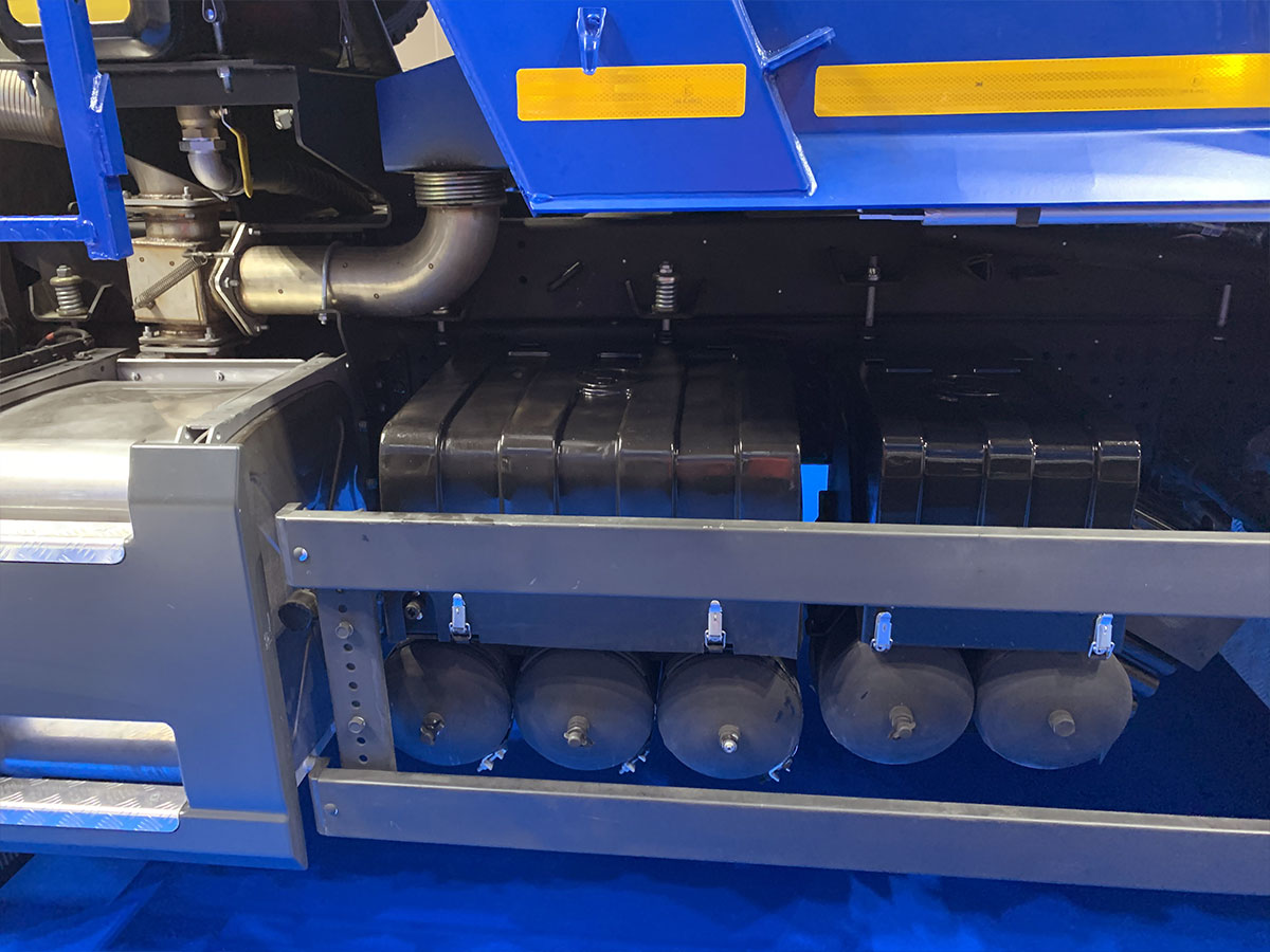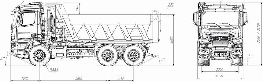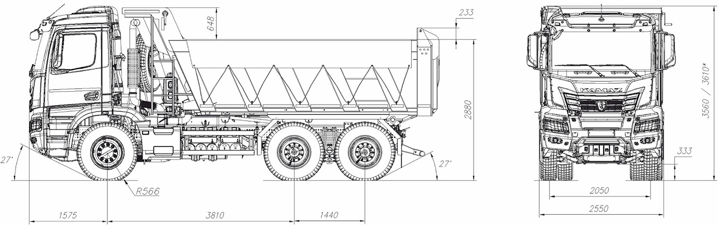 Задняя разгрузка, прямоугольного сечения, двигатель KAMAZ-910.15-450 (Евро-5), система нейтрализации ОГ (AdBlue), АКПП ZF 12TX2825, задний мост Hande, МКБ, ASR, кабина низкая, аэродинамический козырек, кондиционер, ПЖД, тахограф российского стандарта с блоком СКЗИ, мультимедиа БИС, подготовка под установку УВЭОС, обогрев платформы, ДЗК, боковая защита, автономный отопитель кабины Планар