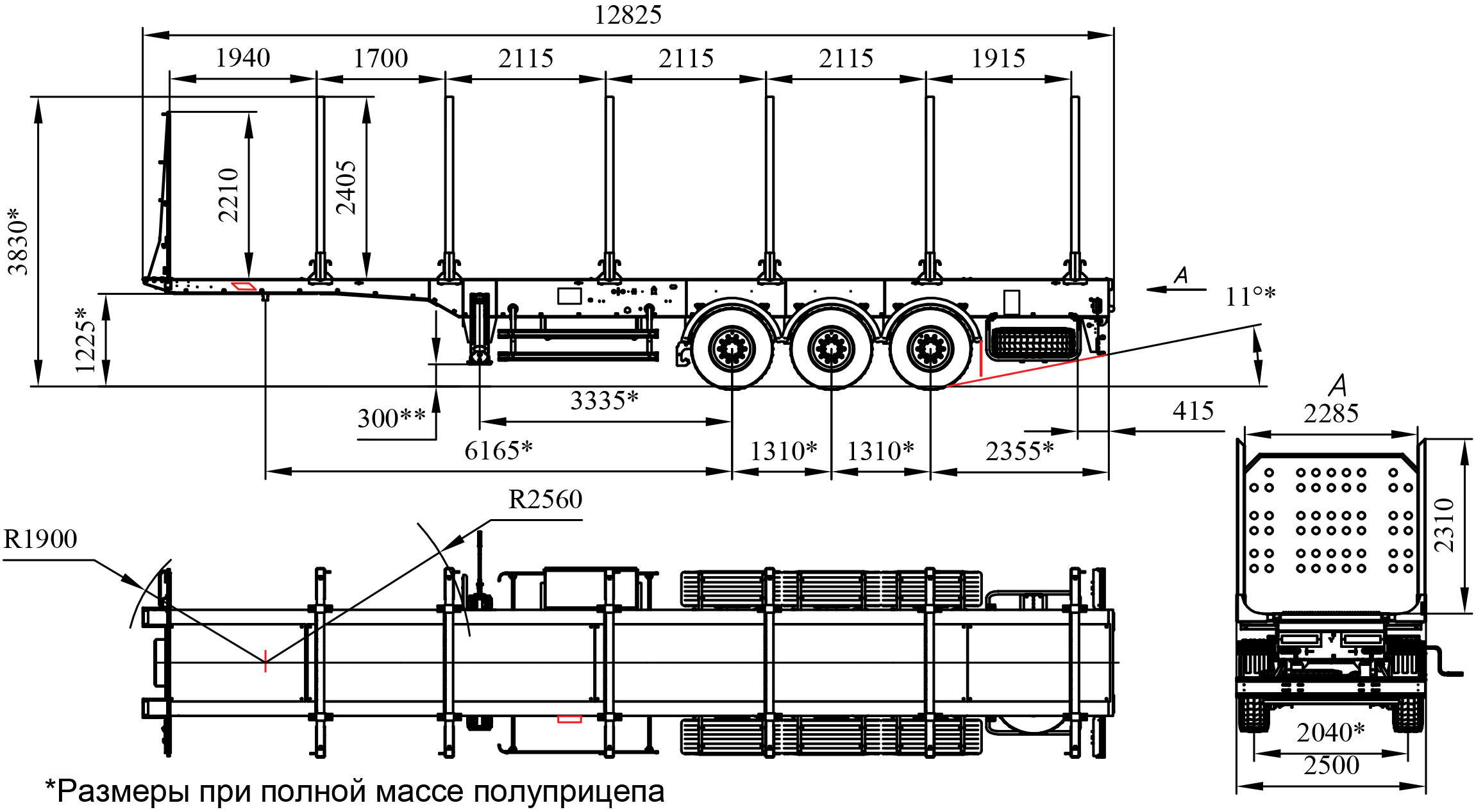 Габаритные размеры полуприцепа сортиментовоза ЧМЗАП 99064-0000540-01: