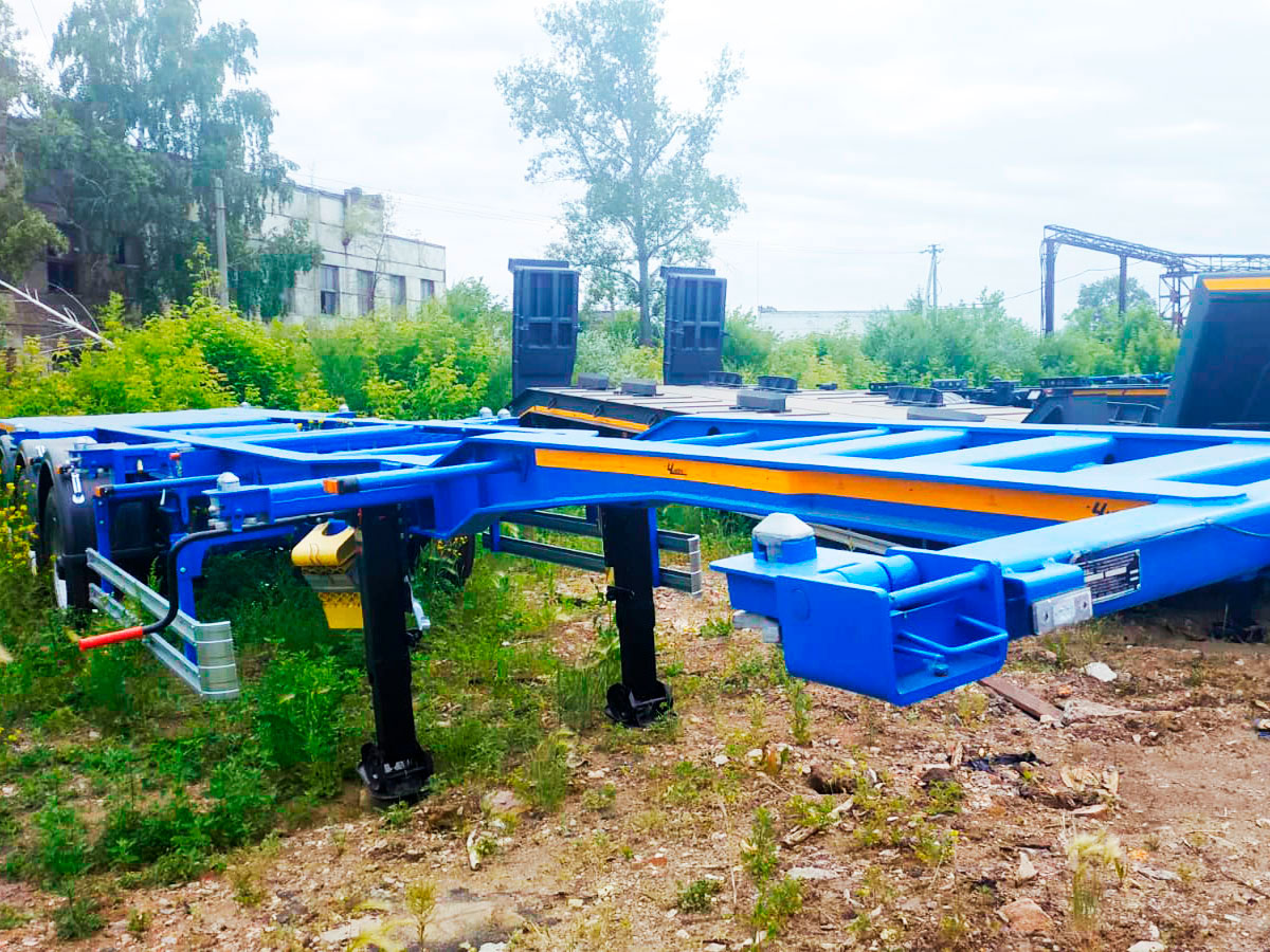 Рама полуприцепа выполнена из высокопрочной стали, что обеспечивает необходимую жесткость при перевозке тяжелых контейнеров. Конструкция предусматривает крепление контейнеров длиной от 20 до 40 футов. Система фиксации включает поворотные замки, которые надежно удерживают груз во время движения и предотвращают смещение при маневрировании.