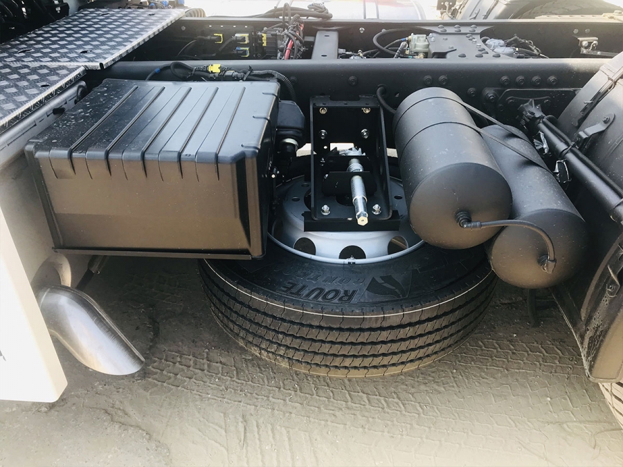 Датчики нагрузки на задние оси, электронный тахограф, аудиоподготовка, кондиционер, автономный отопитель кабины, держатель запасного колеса слева на раме