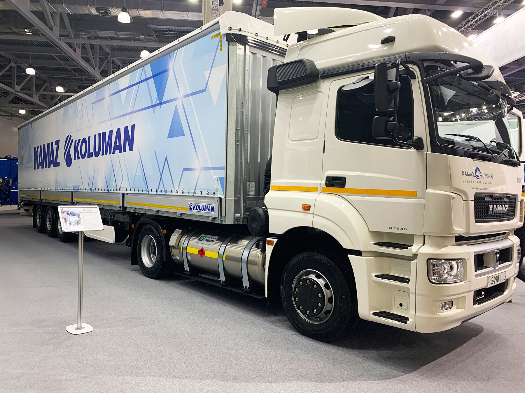 Далее в экспозиции КАМАЗа была представлена сцепка седельного тягача КАМАЗ 5490-80802 на сжиженном природном газе и полуприцепа KAMAZ совместного производства с турецким производителем KOLUMAN.